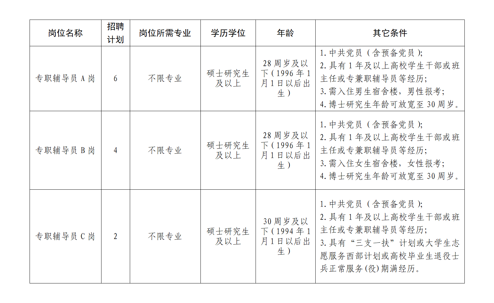 根据学校事业发展需要,现面向社会公开招聘专职辅导员12人,具体岗位及条件详见下表。